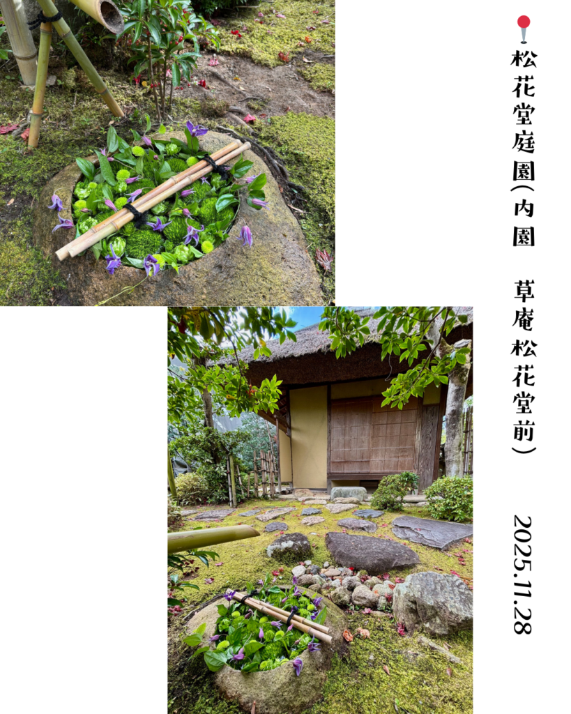 松花堂庭園では、茶室「松陰」前、茶室「梅隠」水琴窟前、この2日間特別公開の草庵「松花堂」前の三ヵ所でそれぞれ違う花手水を見ることができます。