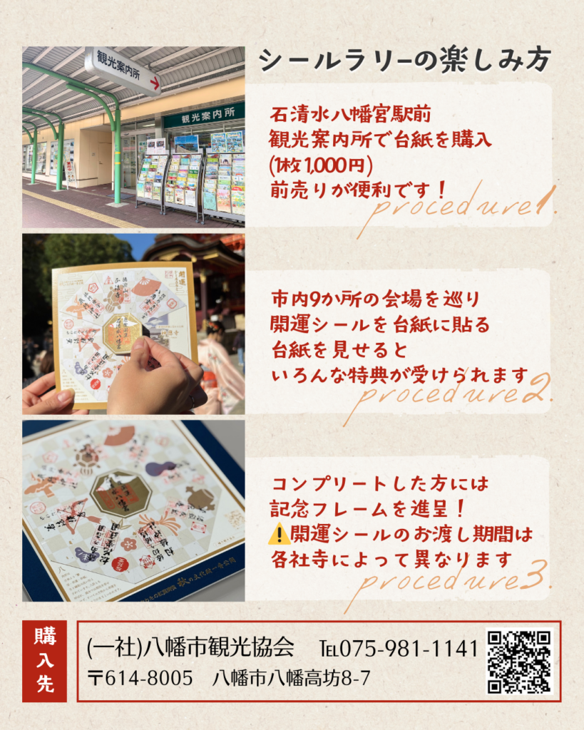 ※石清水八幡宮、飛行神社、善法律寺、松花堂庭園・美術館は、先行して11月22日(土)からシールをお渡しいたします。