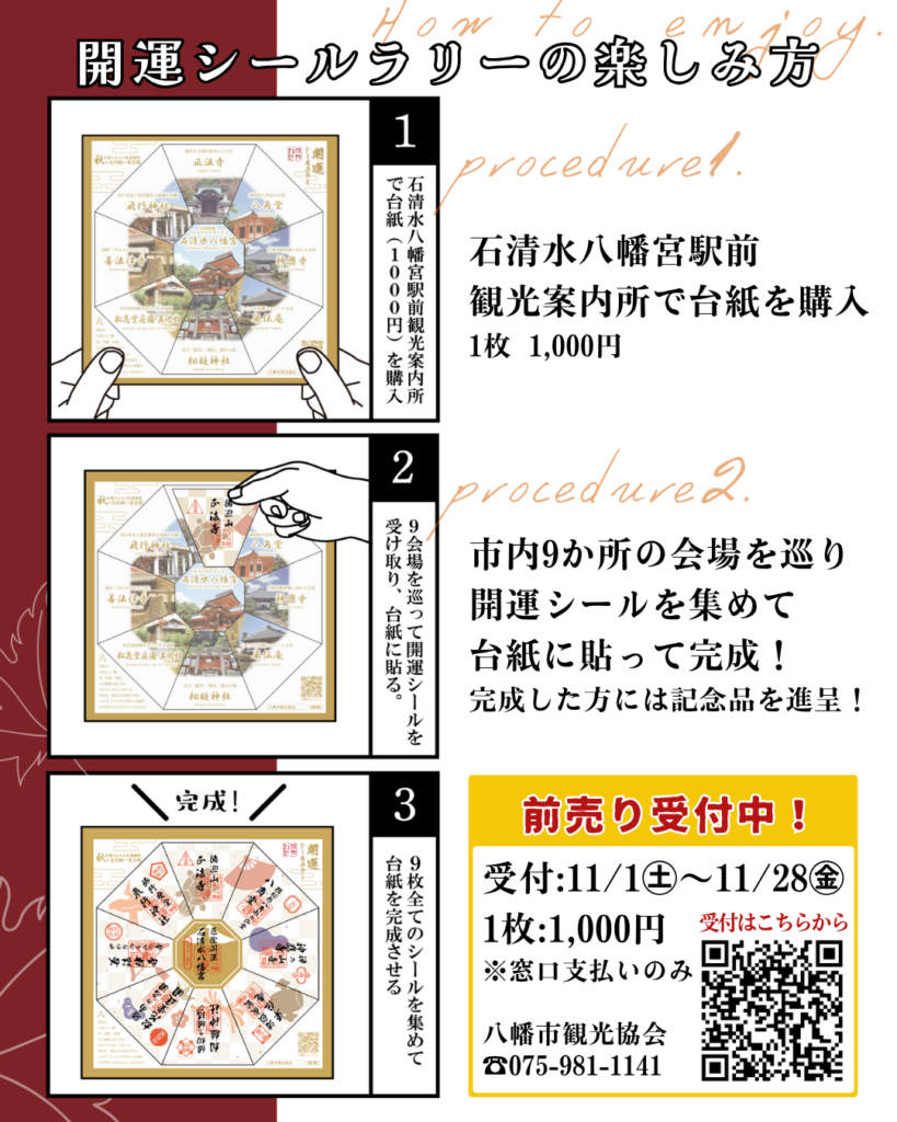八幡市観光協会では、来たる「秋の文化財一斉公開」に先立って、同時開催の開運シールラリー台紙を販売しています🍁