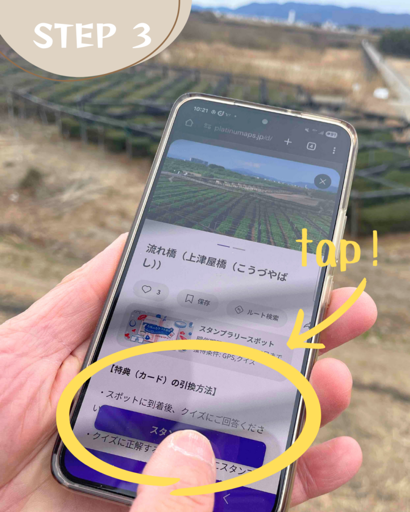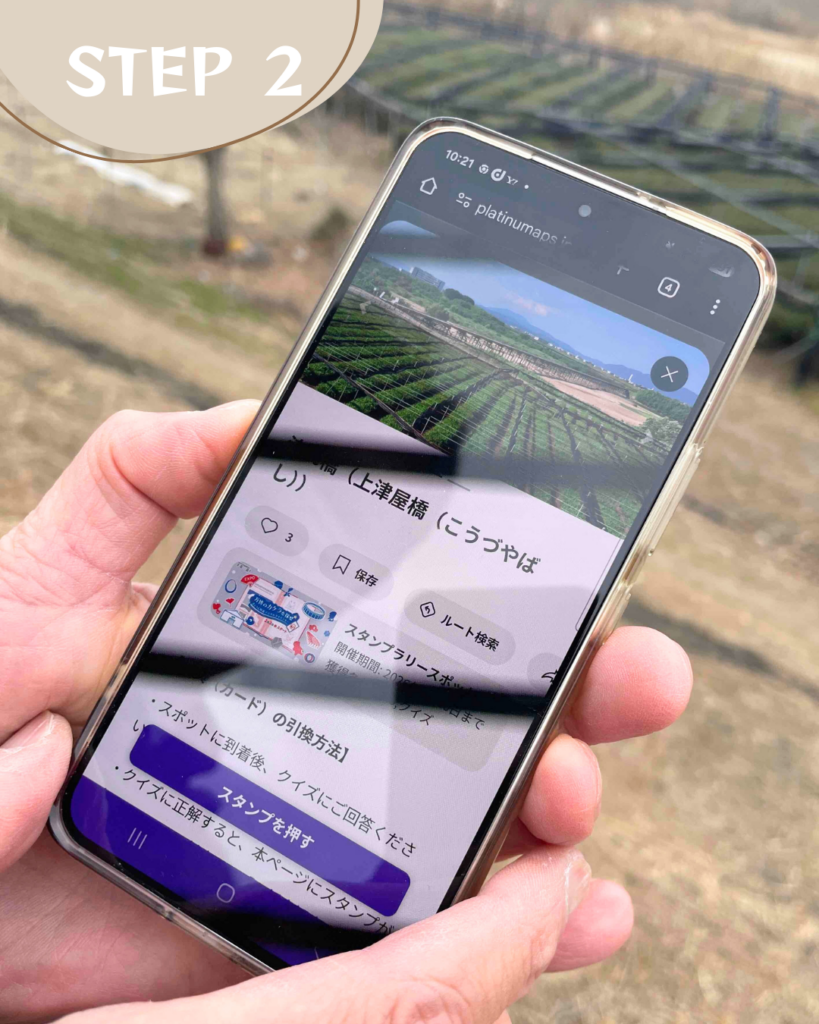 ・STEP2:位置情報(GPS機能)をONにしたスマホで、クイズラリーのウェブページにアクセス。【写真2枚目】