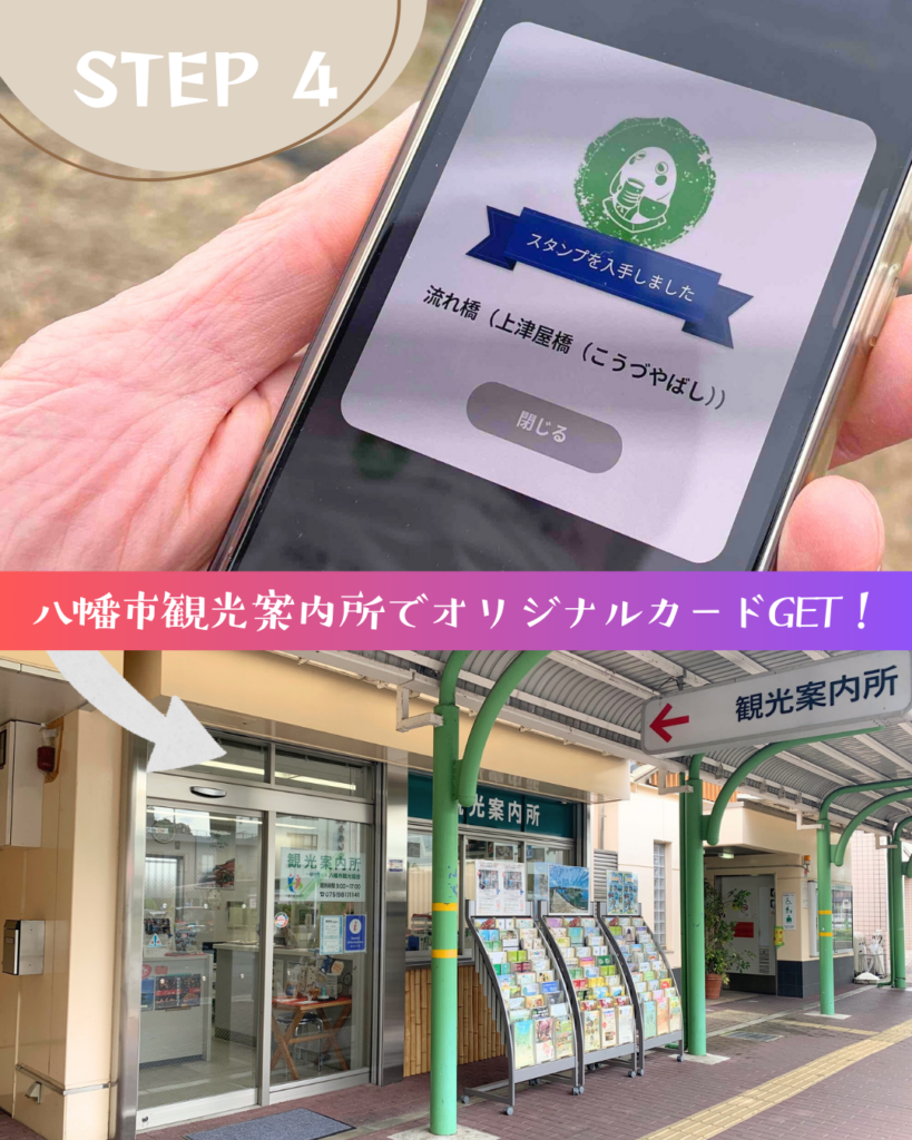 ・STEP4:八幡市観光案内所で、スマホのクイズラリー画面を提示して、オリジナルカード(流れ橋)を受け取ります。
