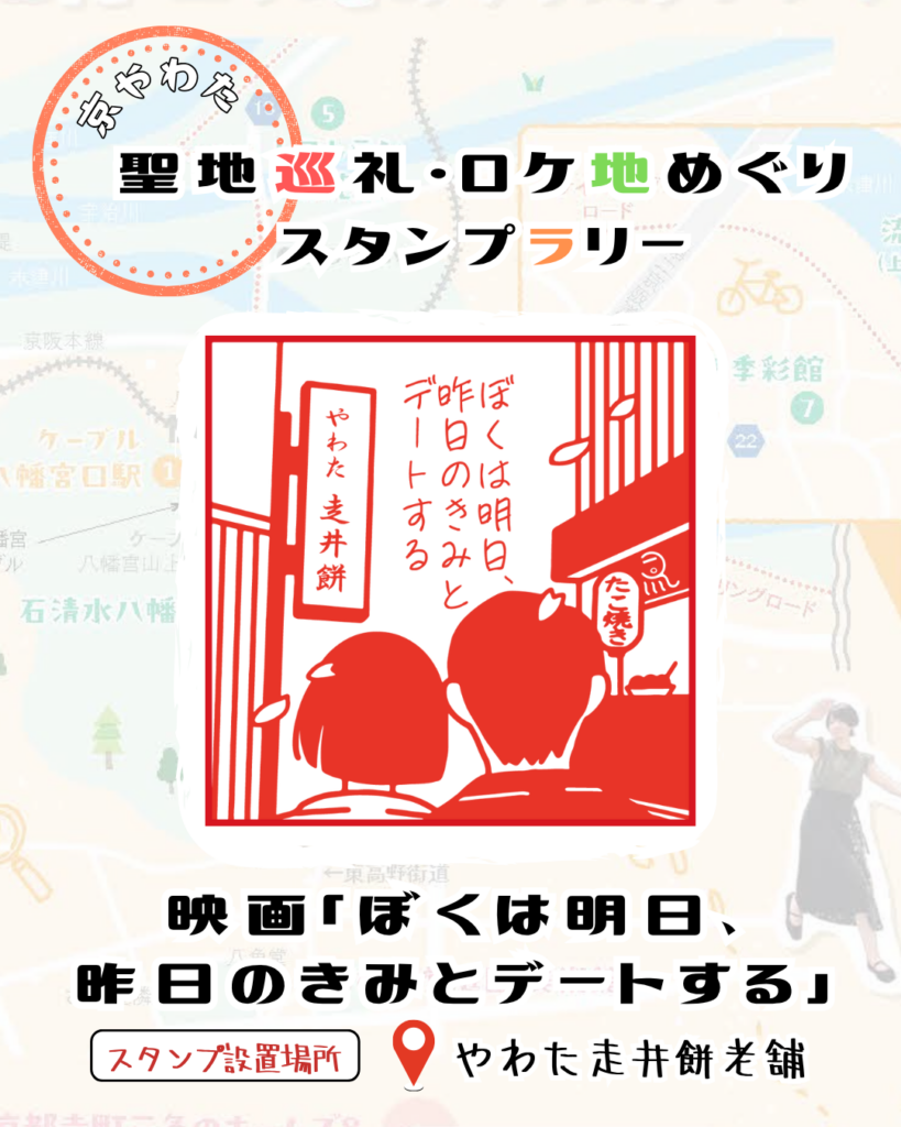 ”泣ける”同名小説が映画化。石清水八幡宮駅前のバスロータリーからデートが始まり、主人公の思い出の場所として、やわた走井餅老舗とたこ焼きいっちゃんが登場します。