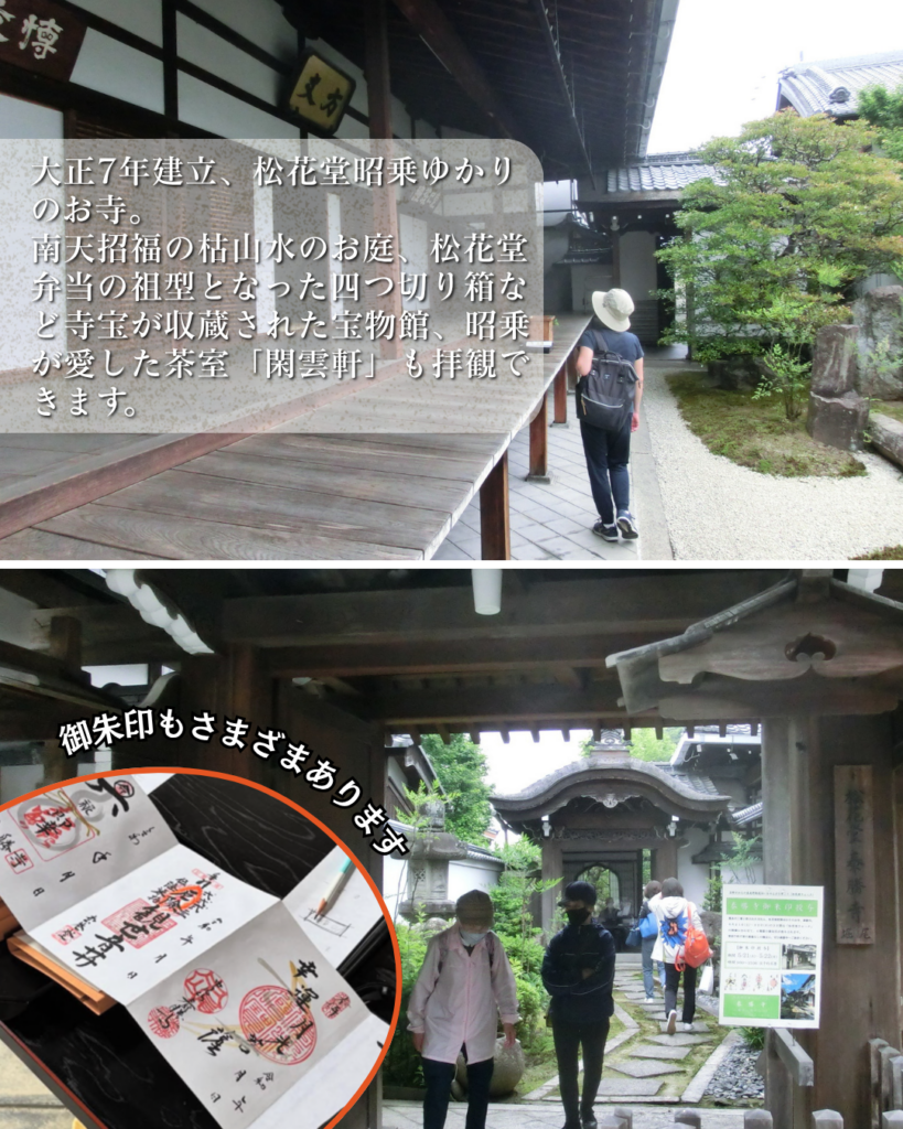 公開日は御朱印の授与があるほか、昭乗が瀧本坊に造ったものを再現し日本百名席にも挙げられた茶室「閑雲軒」、松花堂弁当の祖型となった四つ切り弁当など寺宝が収蔵された宝物館、時期になると南天が実をつける枯山水のお庭を見て回ることが出来ます。