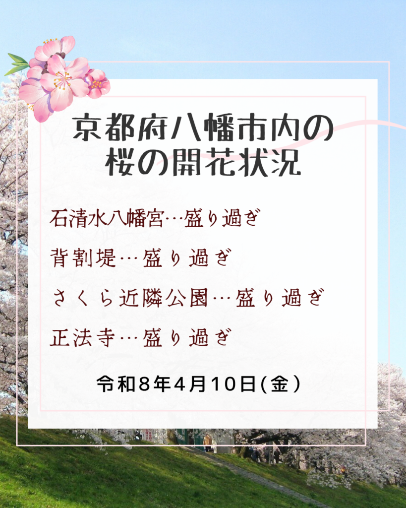 事務局より季節の情報4月10日(金)現在の八幡市内の主な観光スポットの桜の開花情報をお知らせします。