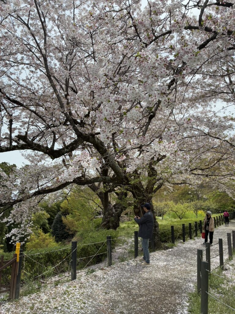 石清水八幡宮境内や男山展望台は、葉桜が混じってきましたが、展望台下の道やエジソン記念碑周辺は桜吹雪とともに名残の桜がお楽しみいただけます。