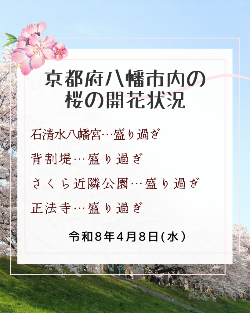 季節の情報4月8日(水)現在の八幡市内の主な観光スポットの桜の開花情報をお知らせします。