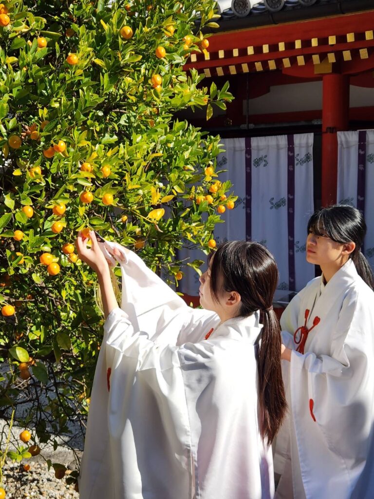 巫女の手で丁寧に収穫された橘の実は、本日23日斎行の新嘗祭で神前に供えられた後、3年間の熟成期間を経て、御神酒「橘酒」として謹製されます。