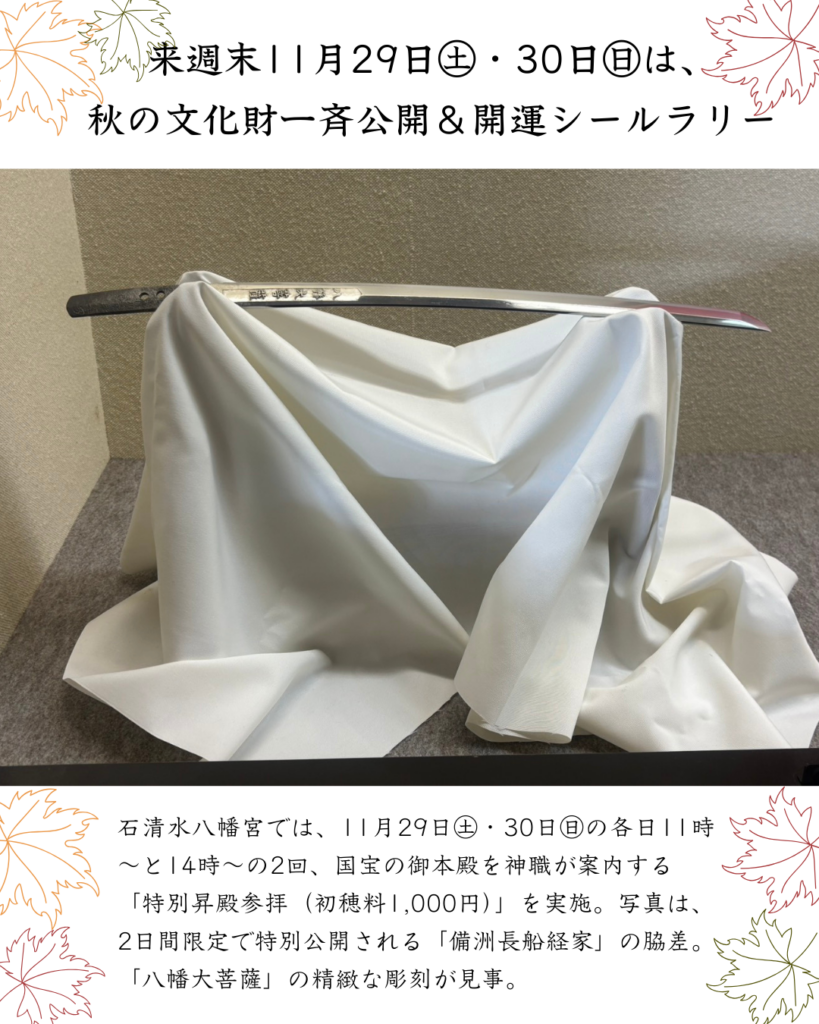 特別昇殿参拝では、「八幡大菩薩」の精緻な彫刻が目を引く「備洲長船経家」の脇差が2日間限定で公開されるほか、今年の勅祭石清水祭で供された12台の供花神饌も公開されます。