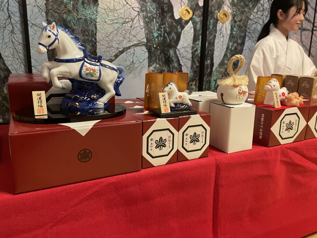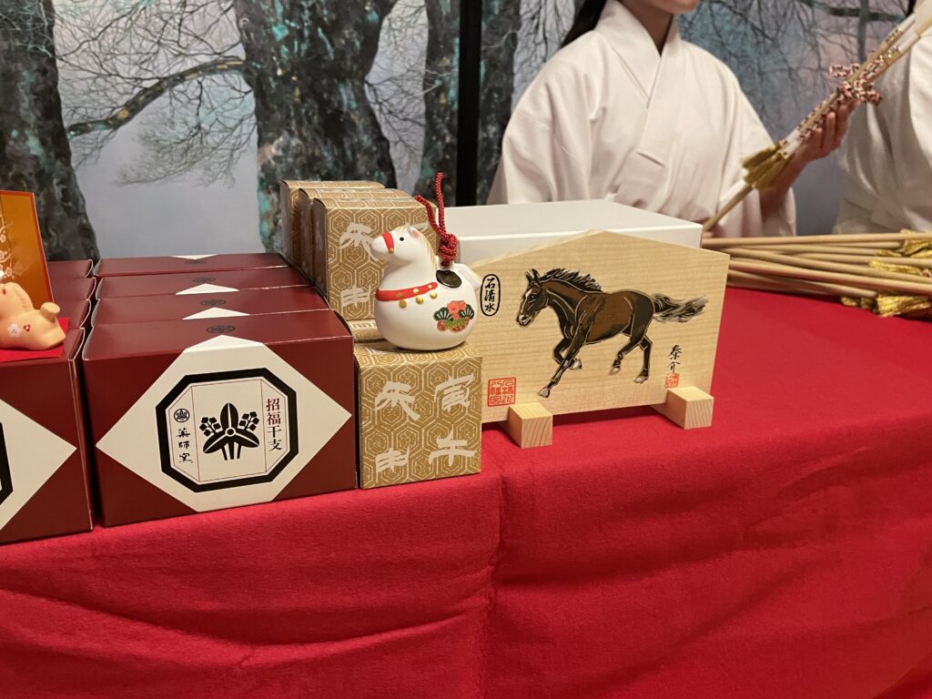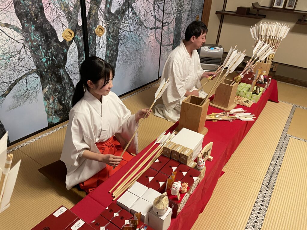 弓矢の神様でもある石清水八幡宮の象徴ともいえる八幡御神矢の矢羽や組みひもに不具合やほつれがないか、来年の干支にあたる「午」の置物などに破損がないかなどの点検・調整が神職や巫女の方々の手で入念に行われていました。