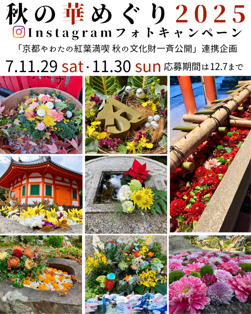 八幡市観光協会では、11月29日(土)・30日(日)、八幡市内の9社寺等の施設で開催する「京都やわたの紅葉満喫 秋の文化財一斉公開」に合わせて「秋の華めぐり2025Instagramフォトキャンペーン」を開催します。
