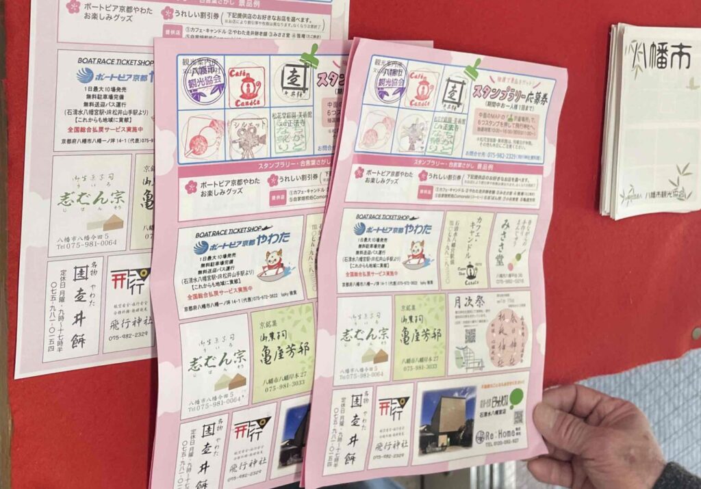 スタンプラリー用紙にもなる「まちかどひなまつりチラシ」は、京阪石清水八幡宮駅前の観光案内所でも配布中!