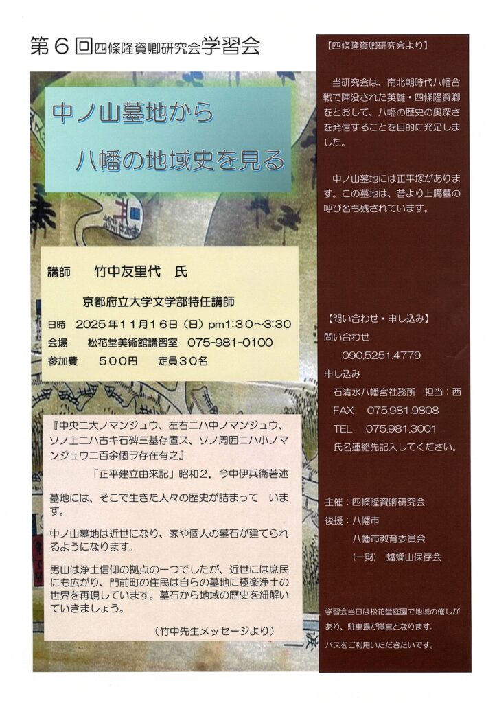 イベント事務局より四條隆資卿研究会では、11月16日(日)開催予定の第6回学習会「中ノ山墓地から八幡の地域史を見る」の参加者を募集中です。