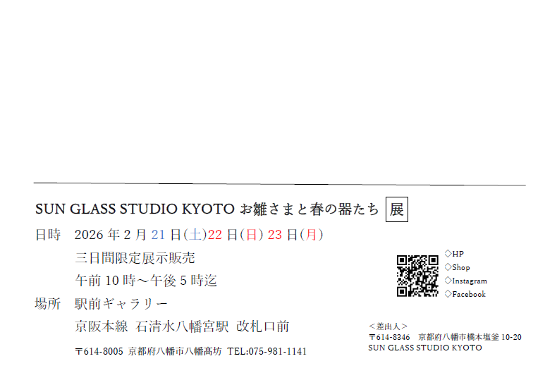 事務局より2月21日㈯~23日(月・祝)の3日間、京阪石清水八幡宮駅改札前の駅前ギャラリーにて、八幡市橋本のガラス工房SUN GLASS STUDIO KYOTOの「お雛さまと 春の器たち展」が期間限定で開催されます。