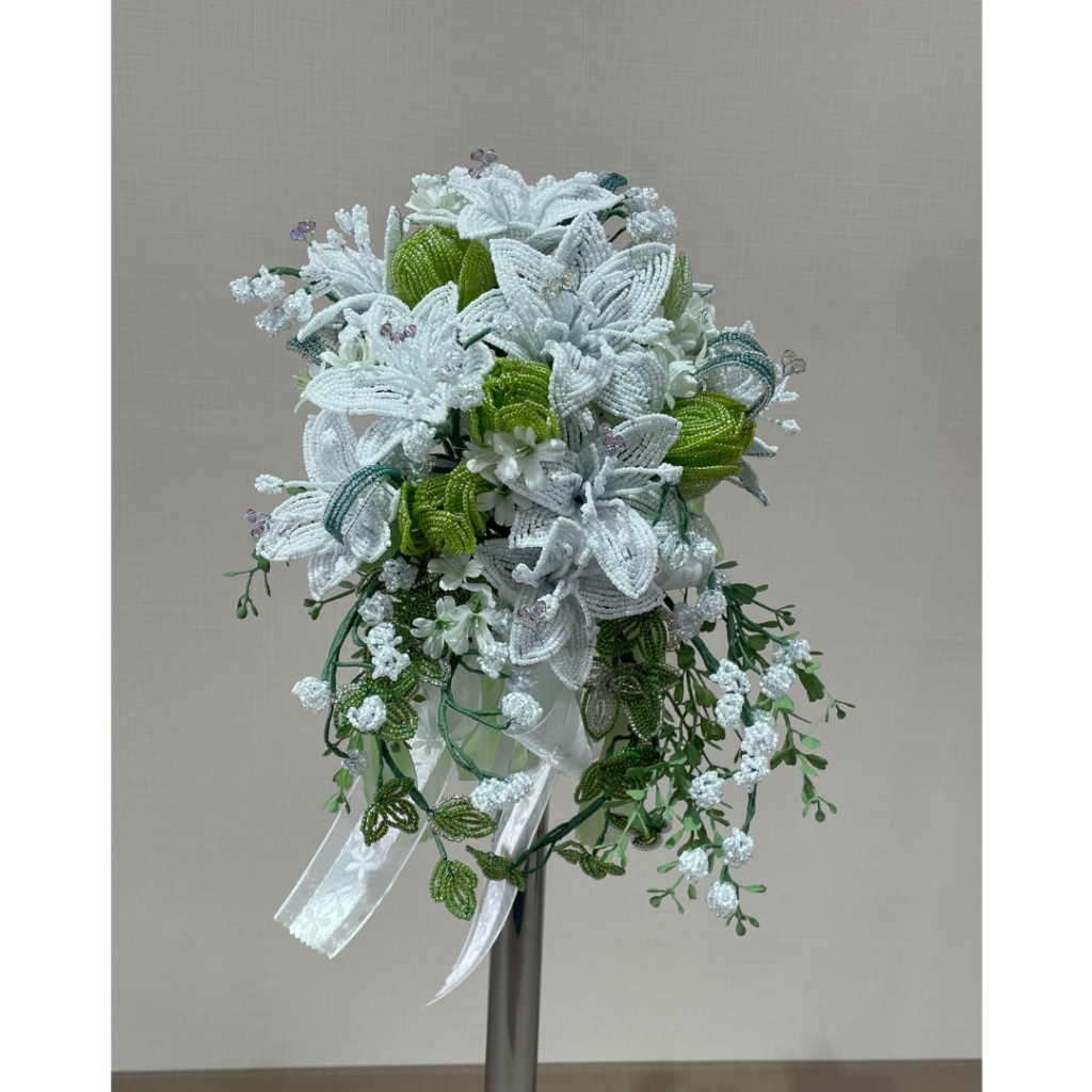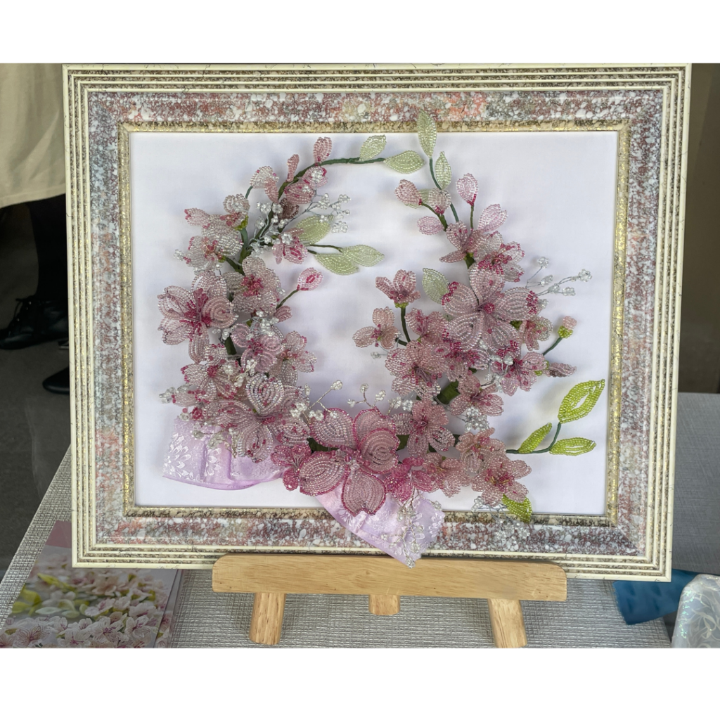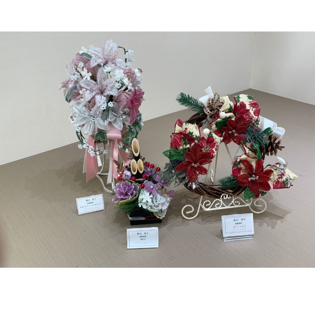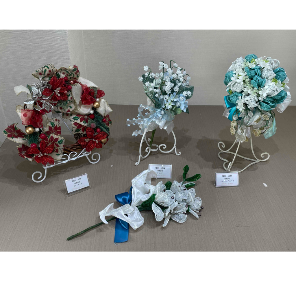 会場内には先生や生徒さんが制作された他のビーズフラワーも展示されており、ビーズで作られたブーケやリース等繊細で綺麗な花たちが多数展示されていました。