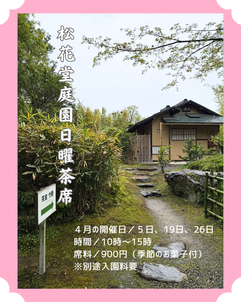そして明日4月5日日曜日には、庭園内の茶室「竹隠」で、10時~15時まで日曜茶席が開催されます。