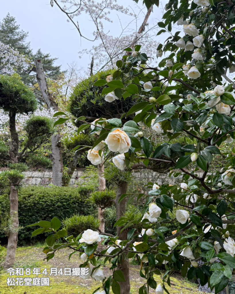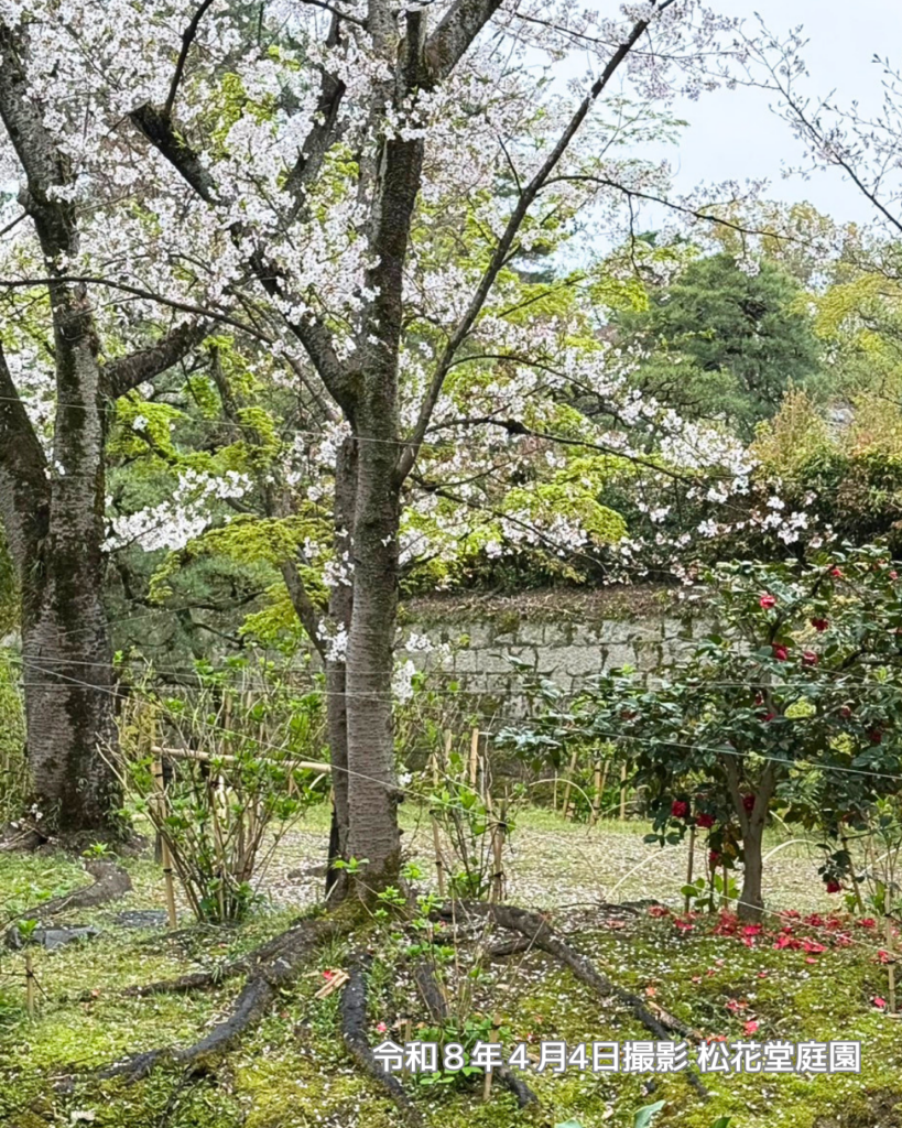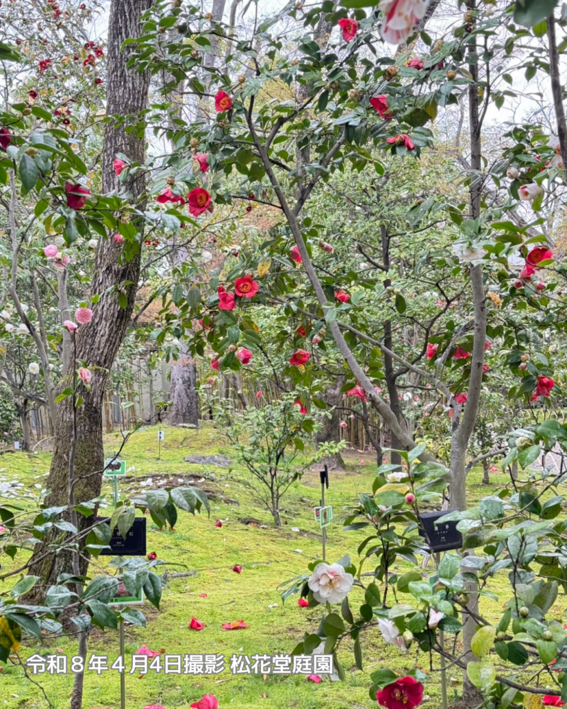 イベント季節の情報4月4日土曜日、八幡市内は雨が降ったり止んだりのあいにくのお天気ですが、松花堂庭園では、桜とともに名残の椿が楽しめます(写真は本日の様子)。