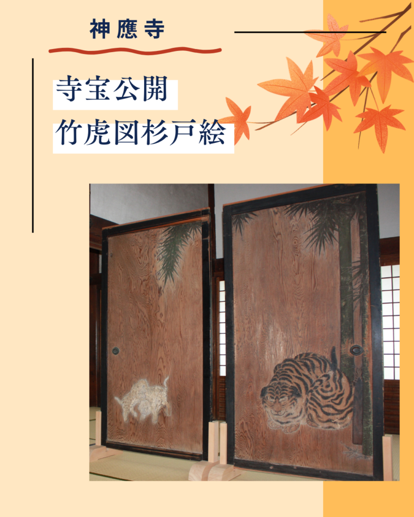 期間中本堂の特別拝観が行われるほか、寺宝「竹虎図杉戸絵(狩野山雪・筆)」も特別公開。