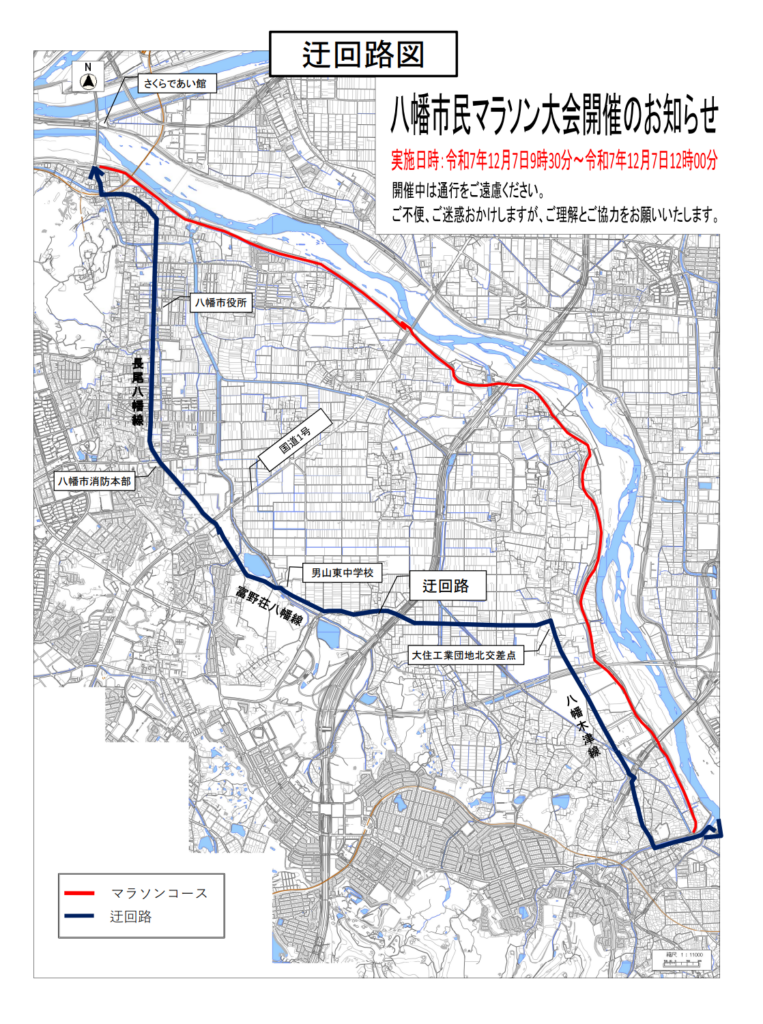 事務局より12月7日(日)開催の八幡市民マラソン大会に伴い、12月7日(日)正午まで府道京都八幡木津自転車道の一部区間がマラソン関係者以外通行止めとなります。