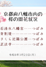 事務局より3月23日㊊現在の八幡市内の主な観光スポットの桜の開花情報をお知らせします。 【石清水八幡宮】つぼみ 【背割堤】つぼみ 【さくら近隣公園】つぼみ 【正法寺】つぼみ 市内あちこちで、桜のつぼみが膨らみ始めました🌸 […]
